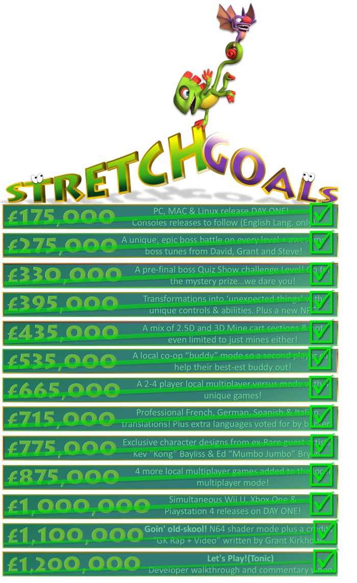 Entwickler Playtonic Games zeigen sich sichtlich erstaunt von dem Erfolg der Kampagne und haben nun bereits neue Ziele und Belohnungen eingebaut. Beim Erreichen 1,1 Millionen US-Dollar beispielsweise wird ein Shader eingebaut, der an die Optik des N64 erinnern soll. Für 1,2 Millionen hingegen werden die Entwickler selbst ein Let’s Play ihres Titels anbieten und bei 1,5 Millionen US-Dollar wird der Soundtrack von Yooka-Laylee sogar von einem Orchester eingespielt. Aktuell steht die Kampagne bei knapp 1,3 Millionen US-Dollar und es sind noch 43 Tage Restlaufzeit übrig. Es ist also zu erwarten, dass das letzte Ziel ebenfalls erreicht wird und Playtonic sich noch einmal etwas einfallen lassen müssen. Ich für meinen Teil freue mich wie ein kleines Kind auf den Titel, habe ich doch mit den älteren Titeln der Entwickler eine Menge Spaß gehabt.