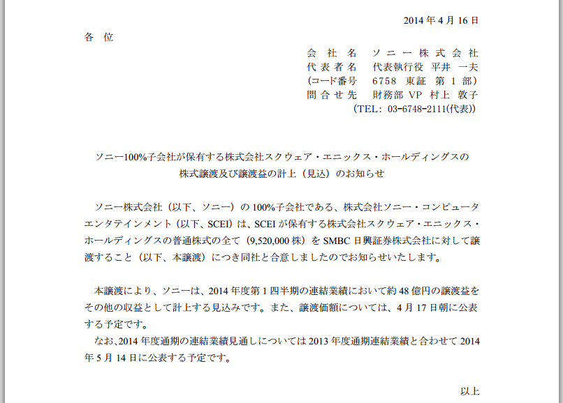 Sony Japan Pressemitteilung / SMBC Nikko Securities / Siliconera / Square Enix Logo / Sony Logo