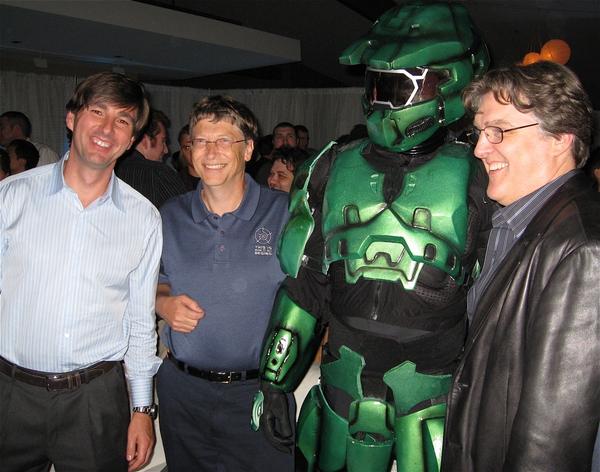 Marty O'Donnell (ganz rechts), Master Chief (Mitte rechts), Bill Gates ((Mitte links), Don Mattrick (ganz links).