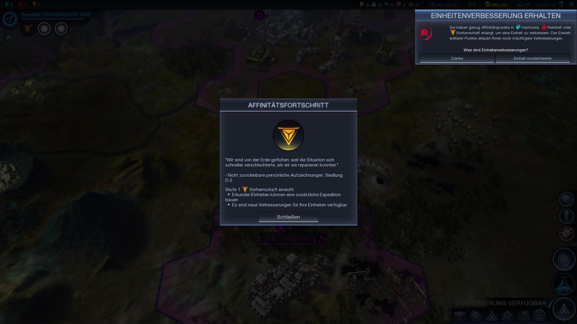 So cool der Raumschiff-Baukasten zu Beginn des Spiels wirkt, so einfach ist er auch. Denn sobald die ersten 100 Runden ins Land gegangen sind, interessiert es kaum noch, ob man nun mit Flüchtlingen oder Ingenieuren gelandet ist. Zum Glück weiß Firaxis aber auch hier Abhilfe und die kommt in Form der Affinitäten.