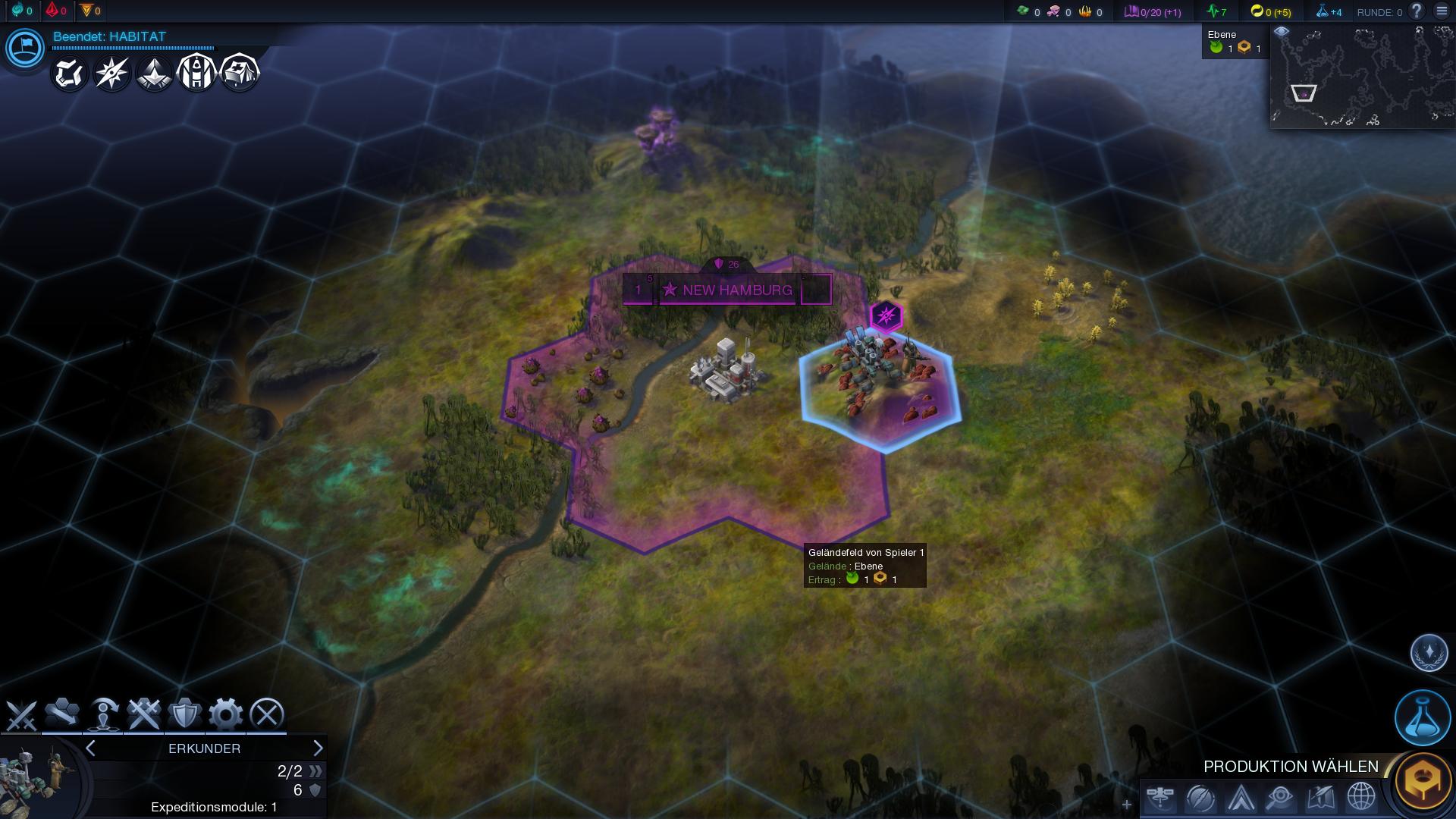 Sind alle Vorbereitungen getroffen, kann die Reise endlich losgehen. Wir wählen aus verschiedenen Planeten, die alle unterschiedliche Ökosysteme mitbringen. So könnten wir uns in dieser Partie auf einem erdähnlichen Planeten niederlassen oder unser Glück auf einer Welt versuchen, die mit pilzartigen Pflanzen übersät ist. Haben wir uns entschieden, fehlt nur noch die Suche nach einem passenden Landeplatz. Schließlich wollen wir unsere Kolonisten nicht irgendwo im Nirvana absetzen. Ist auch dieser gefunden steht unser erster Außenposten: New-Hamburg.
