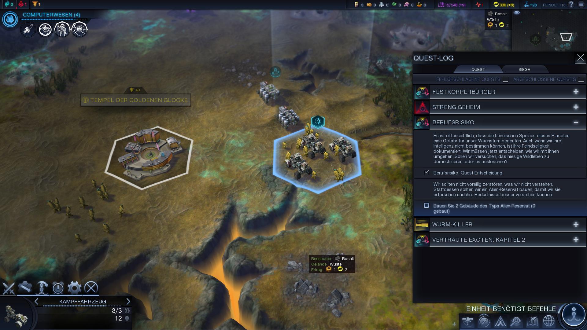 Quests in Strategiespielen haben schon damals bei Warcraft erstaunlich gut funktioniert. Das dachte sich wohl auch der Entwickler Firaxis und so kommt Beyond Earth ebenfalls mit einem Questsytem daher. Nicht, dass es dem Spiel an Langzeitmotivation mangeln würde. Nein, die Quests sind allerdings ein abwechlungsreiches Feature, das zur Erkundung des Planeten ermutigt und obendrein den Wiederspielwert erhöht. Absolvieren wir nämlich eine Quest, können wir häufig aus verschiedenen Belohnungen auswählen und zum Beispiel Gebäuden oder Einheiten einen einzigartigen Bonus verpassen. Diese können sich auf lange Sicht spielentscheident auswirken und laden dazu ein, sich in der nächsten Partie vielleicht anders zu entscheiden.