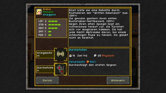 Ein Rollenspiel funktioniert natürlich nicht ohne einen Helden oder eine Heldentruppe. Und so finden wir uns am Anfang der Reise in einer Taverne wieder, in der diverse Abenteurer darauf warten angeheuert zu werden. Da wäre zum Beispiel Pico, der Halbling mit der Vorliebe für verbrannte Spiegeleier. Oder Tupac, der Kräutermann, der ständig benebelt ist und nur Holländisch spricht. Schnell wird klar, dass die Jungs von The Bitfather bekannte Klischees und Stereotypen geradezu aufsaugen und über das gesamte Spiel verteilen. Abgeschmeckt wird das Ganze mit einer großen Portion eigener witziger Ideen.